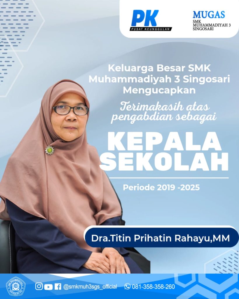 Kepemimpinan Ibu Dra. Titin Prihatin Rahayu, MM selama Dua Periode (2019–2025) menjadi salah satu fase penting dalam perjalanan SMK Muhammadiyah 3 Singosari. Di tengah dinamika dunia pendidikan, perubahan kurikulum, hingga tantangan pandemi, beliau menunjukkan keteguhan, kedisiplinan, dan keteladanan seorang pemimpin yang bekerja dengan hati dan penuh keikhlasan.