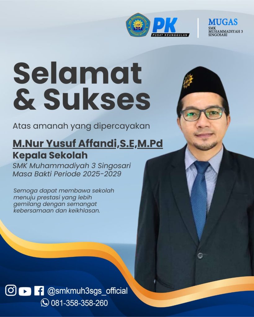 Singosari, 2 Desember 2025 — SMK Muhammadiyah 3 Singosari menyelenggarakan kegiatan Serah Terima Jabatan (Sertijab) Kepala Sekolah sebagai momentum penting dalam kesinambungan kepemimpinan sekolah. Acara ini menandai berakhirnya masa tugas Ibu Dra. Titin Prihatin Rahayu, MM sebagai Kepala Sekolah periode 2019–2025, sekaligus pengalihan amanah kepada pemimpin baru, Bapak Muhammad Nur Yusuf Affadi, SE., M.Pd. untuk masa bakti 2025–2029.